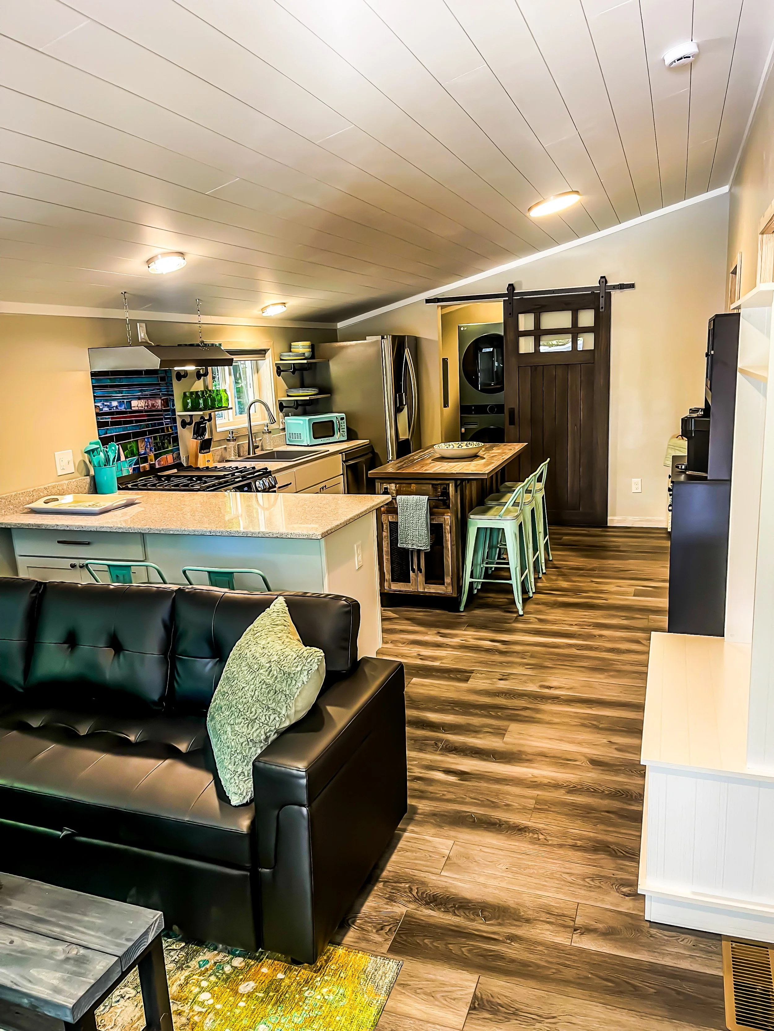 Our cabin offers a fully equipped kitchen with modern appliances, including a gas range with air fryer, full-size fridge, and coffee station. The living area features comfortable seating, smart TVs, and a charging station. For added convenience, we provide a washer and dryer, central air, and a fireplace.