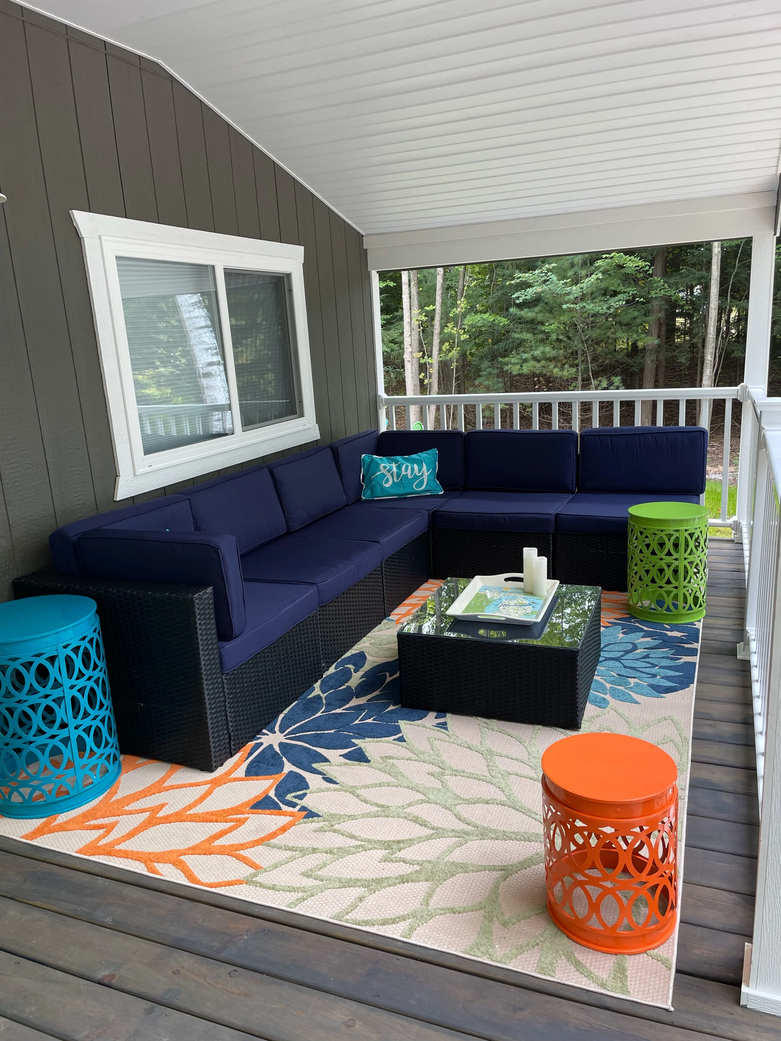 Large covered deck with small two top table for dining as well as an outdoor lounge sectional and table.