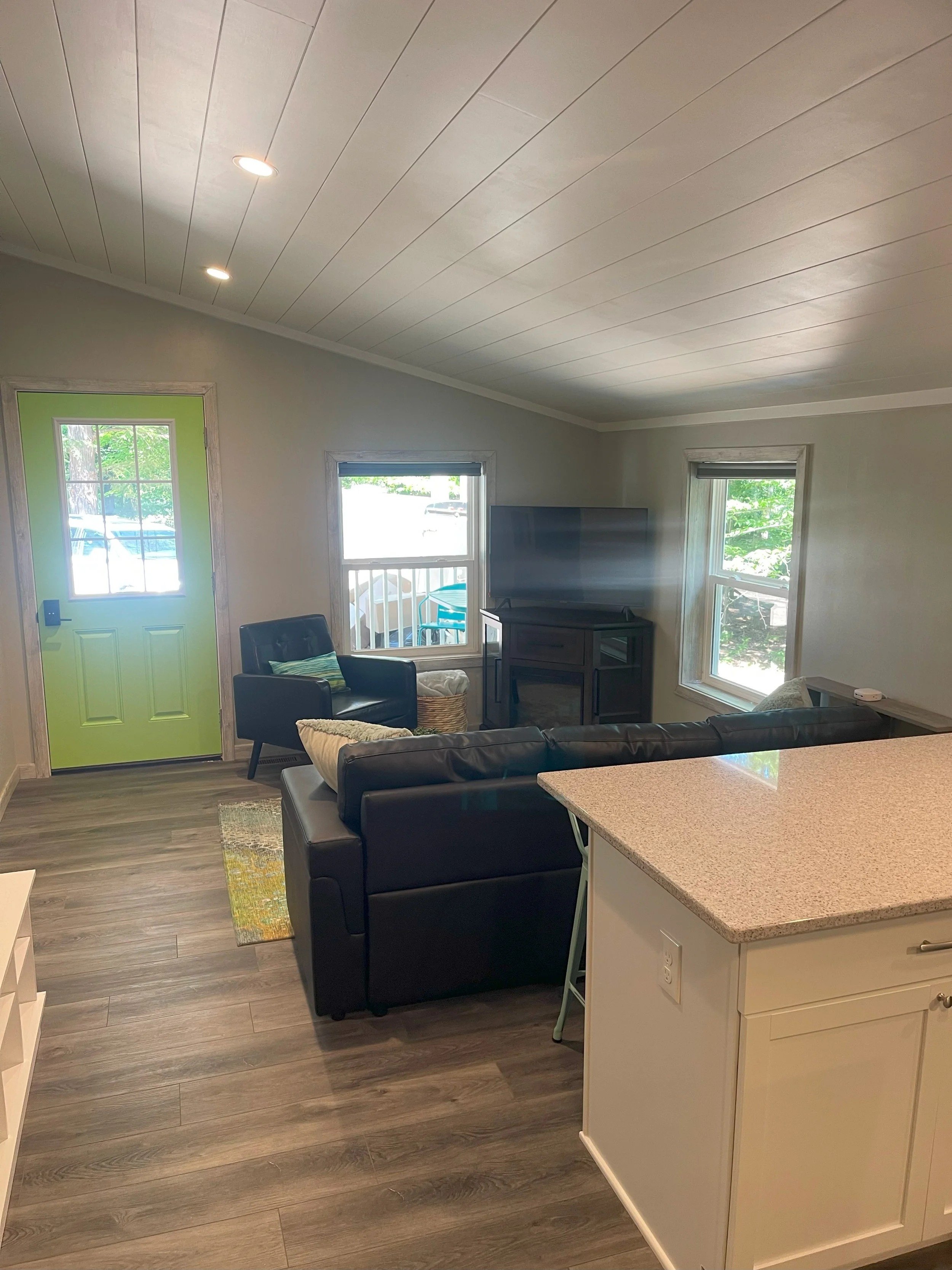 All our beds are brand new memory foam mattresses.(Nectar Kings & Serta Twins) Our bunk room has a King size main bed, Twin Bunk & another Twin trundle you can slide out to sleep more cubs. Our couch also has a slide out for sleeping/bed size space too! Both bedrooms feature smart TV’s and end tables with plugs & usb plugs for easy charging of your devices. Both bedrooms also have tall hanging bars for dresses/trains/etc.
